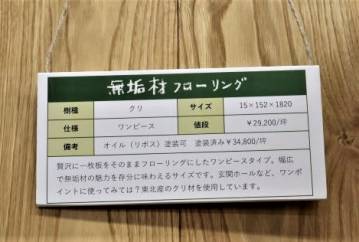 無垢材フローリングカードには、種類ごとに青森ヒバやオニグルミなどの樹種名、サイズ、仕様、値段、特徴などが明記されているので、選びやすくなっています。