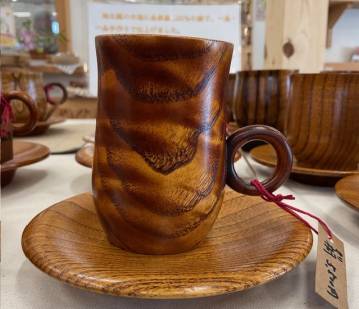 ブドウのつるの太い部分で作られています。乾燥の過程で非常に割れやすく、3割ほどしか完成品にならないそうです。ソーサーはブドウのつるを輪切りにしたものです。漆で描いた蒔絵とも相まって可愛らしい雰囲気です。